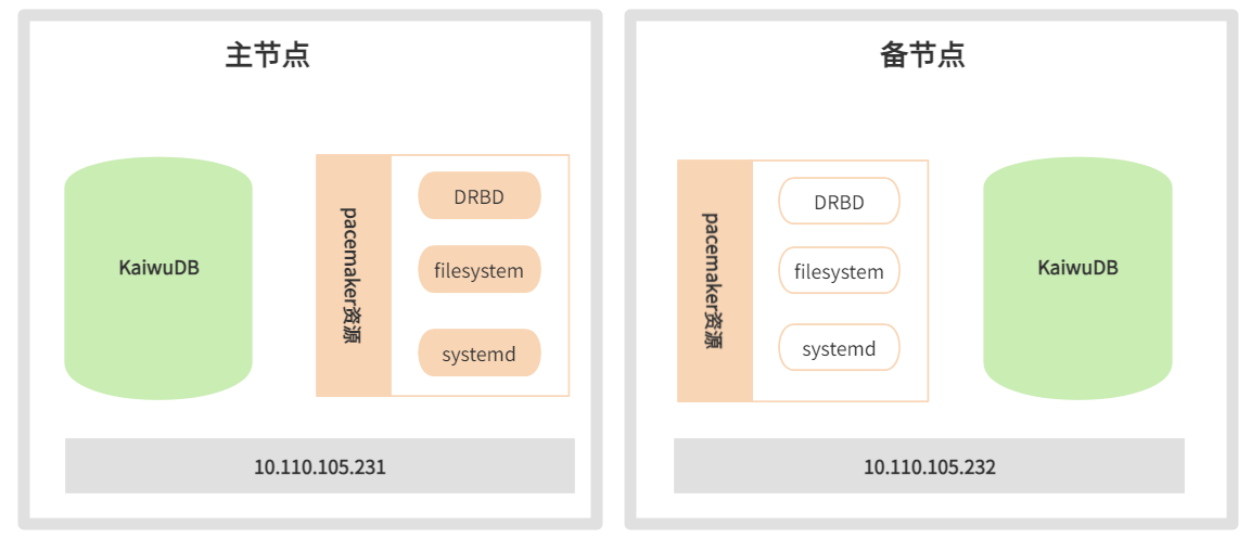 KaiwuDB 单节点部署支持采用基于 DRBD 块设备复制的开源软件方案,以实现主备节点间的数据复制。使用 Pacemaker 方案用于监控运行状态,进行健康检查。Pacemaker 方案是 Linux-HA 工程的一部分,也是目前最成功开源高可用项目之一。Pacemaker 方案通过心跳服务和集群通信两项关键技术,构建了一个高可用集群,能够监控集群中各类资源的状态,执行实例漂移、主备切换等多种功能。