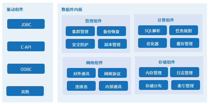数据库管理系统:对数据库进行统一管理和控制的大型软件,通常用于建立、使用和维护数据库。数据库管理系统由内核组件集和驱动组件构成,其中内核组件集包括管理组件、存储组件、计算组件和网络组件。