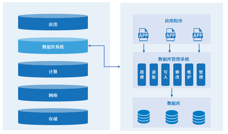 广义数据库通常指数据库系统,包括数据库和数据库管理系统两部分。数据库系统向上通过数据库管理系统支撑应用引擎,向下以数据库承接文本、数字、图像等数据源,调动计算、网络、存储等基础资源。