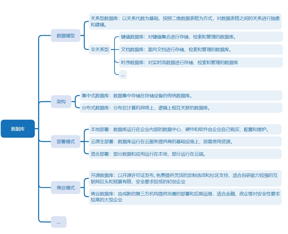 数据库可以按照不同维度进行分类,常见的分类依据包括数据模型、架构、部署模式等。一个数据库按照不同的分类依据可能分属于不同的类型。