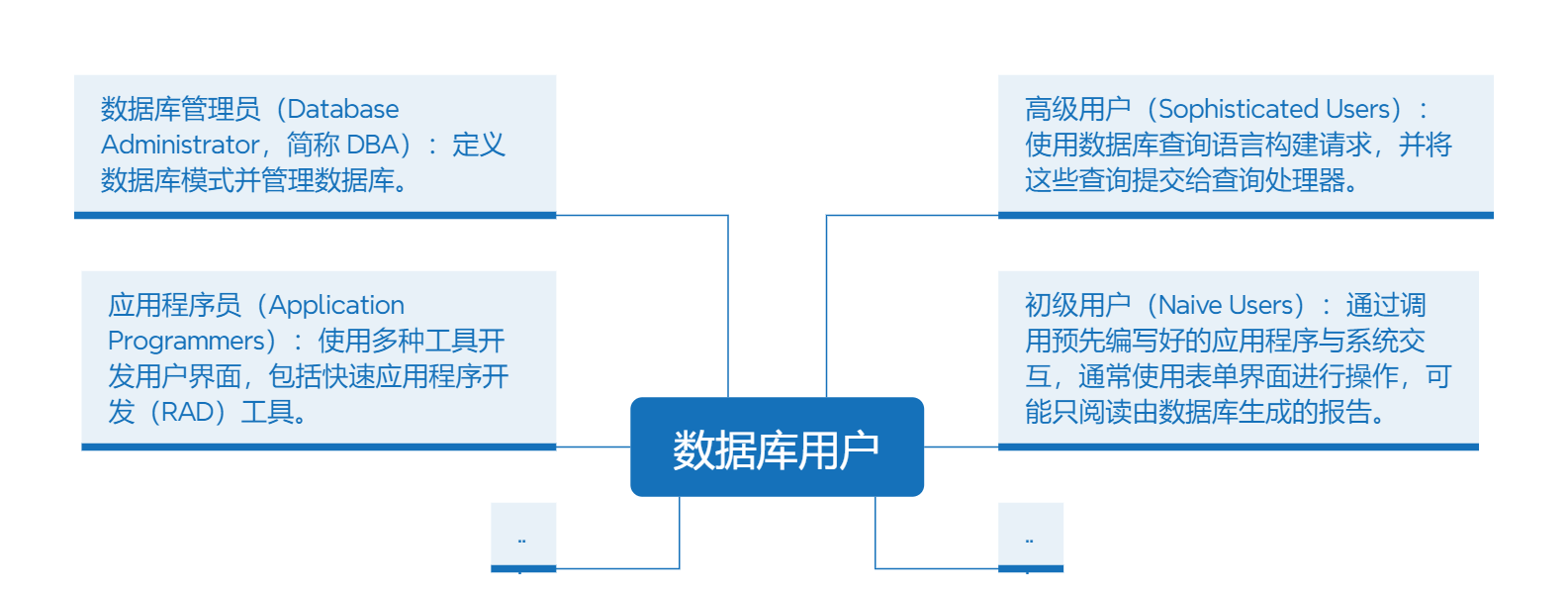 任何通过应用程序访问数据库的人都属于数据库用户。数据库用户根据用户与数据库的交互方式可以分为不同类别。