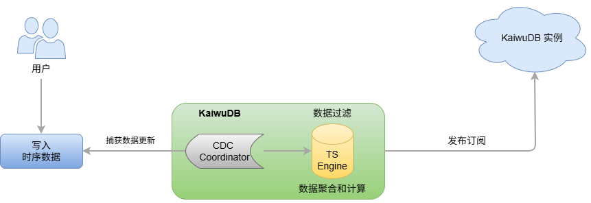 KaiwuDB 流计算功能使用变更数据捕获(Change Data Capture,CDC)机制实时捕获写入的时序数据,并使用 SQL 语句定义实时流变换。当数据写入流计算的源表后,系统使用定义的方式自动处理数据,并把处理结果写入目标表。