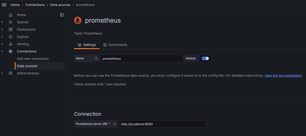 http://localhost:3000。用户可以使用默认的用户名和密码(均为admin)登录 Grafana。在 Grafana 左侧边栏,单击 Connections > Data sources。