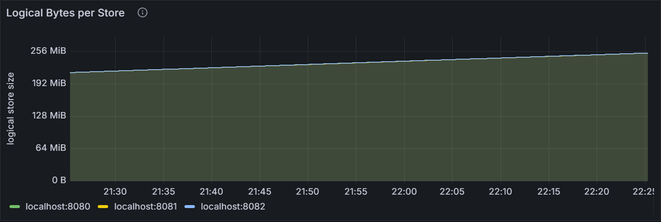 该时间序列图展示指定节点或者集群内所有节点的每个 Store 的数据逻辑字节数,包含历史数据和已删除数据。