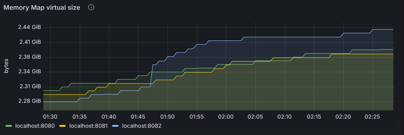 该时间序列图展示指定节点占用的 Memory Map 虚拟内存量或者集群内所有节点占用的 Memory Map 虚拟内存总量。