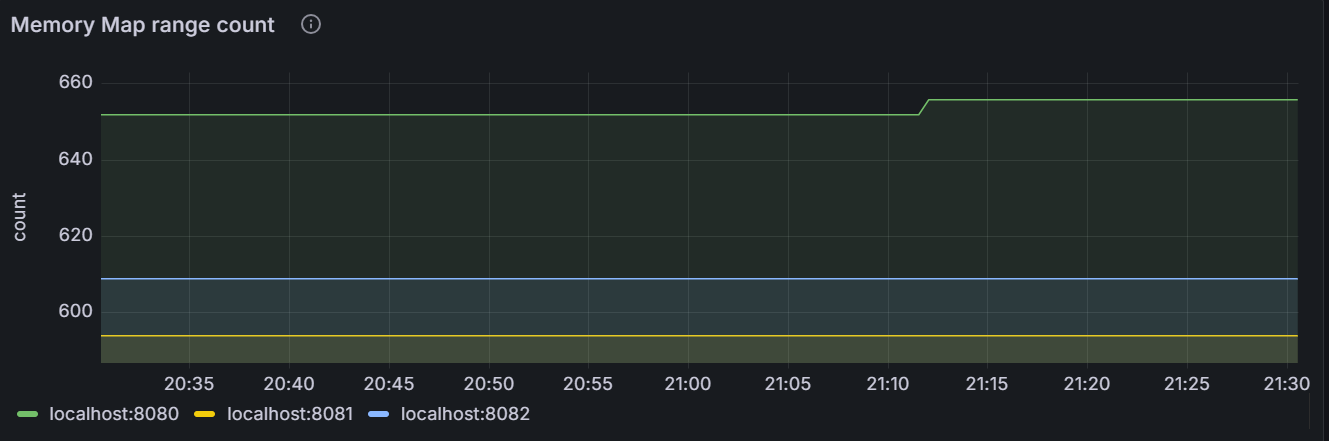 该时间序列图展示指定节点和集群内所有节点进程中连续开启的虚拟内存块的数量。单个节点中,每个内存块的大小可能不同,所有内存块的大小总和即为该节点占用的 Memory Map 虚拟内存量。所有节点的内存块的大小总和即为该集群所有节点占用的 Memory Map 虚拟内存总量。