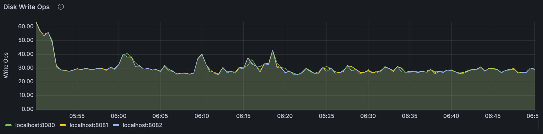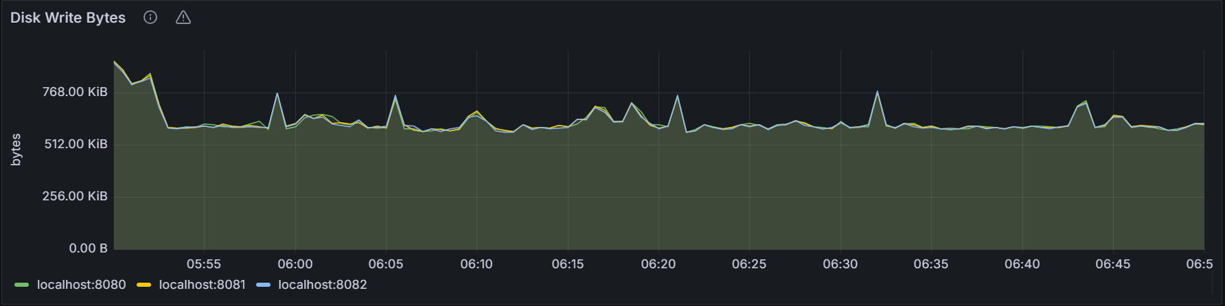 该时间序列图展示指定节点或者集群内所有节点上运行的所有进程(包括 KaiwuDB 进程)写入硬盘的速率。采样值为