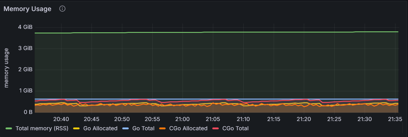 该时间序列图展示指定节点或者集群内所有节点上 KaiwuDB 进程的内存使用情况。