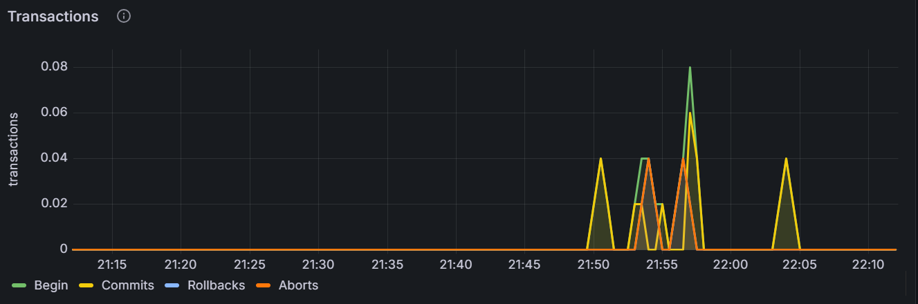 在节点视图中,该时间序列图展示指定节点每秒打开、提交、回滚或中止的事务总数。采样值为