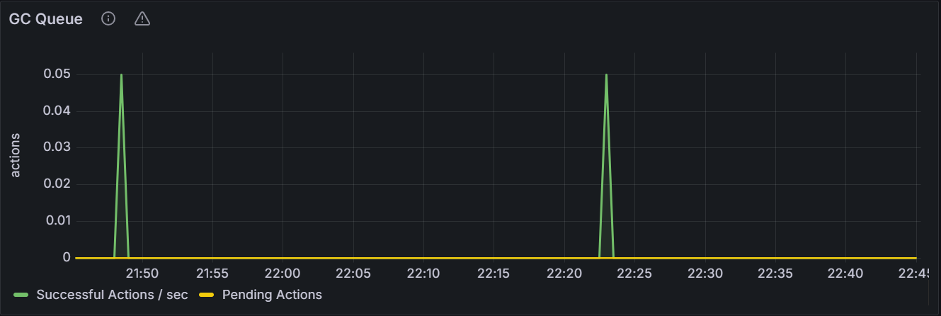 在节点视图中,该时间序列图展示指定节点的 GC 队列数目。在集群视图中,该时间序列图展示集群中所有节点 GC 队列数目总和。