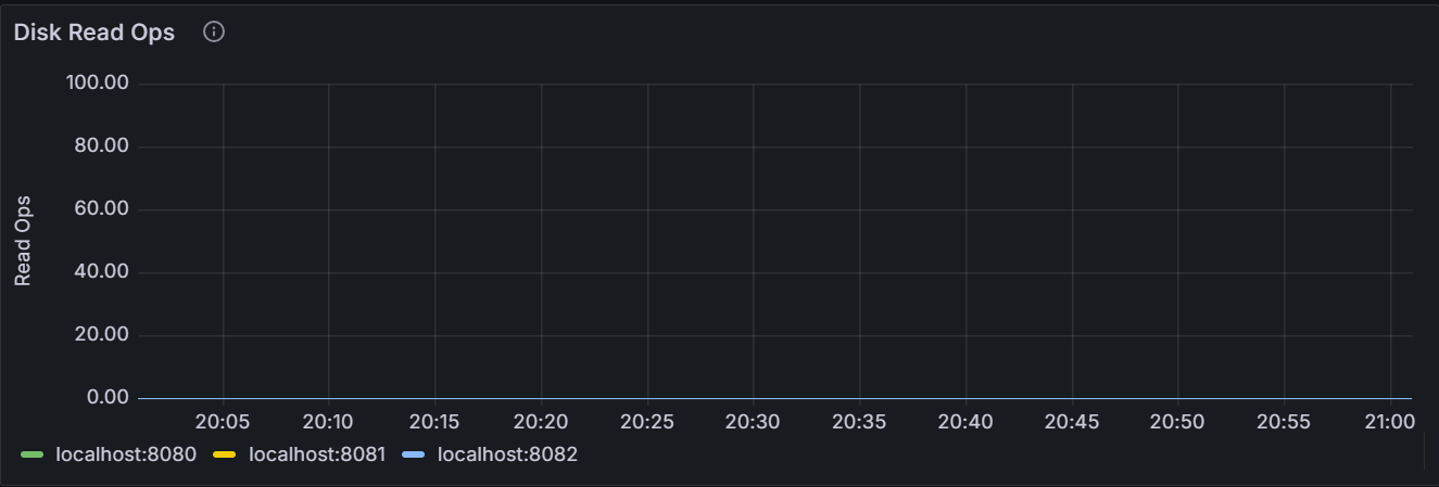 该时间序列图展示指定节点或者集群内所有节点上运行的所有进程(包括 KaiwuDB 进程)读取硬盘的速率。采样值为