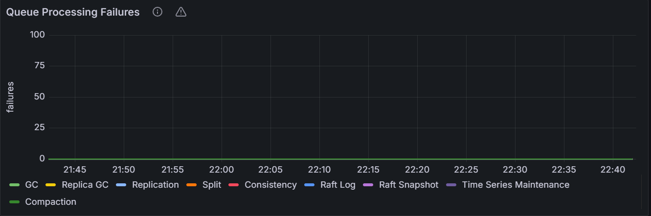 在节点视图中,该时间序列图展示指定节点过去一分钟 KV 事务持续时间的 99th 百分位数,即在观察时间内,99% 的持续时间低于或等于这个值。在集群视图中,该时间序列图展示集群中所有节点过去一分钟 KV 事务持续时间的 99th 百分位数,即在观察时间内,99% 的节点的持续时间低于或等于这个值。