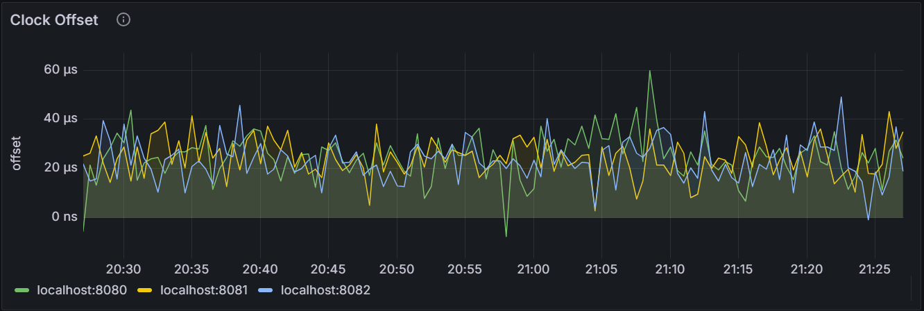 在节点视图中,该时间序列图展示指定节点与集群其他节点的时钟偏差值的平均值。在集群视图中,该时间序列图展示集群中每个节点与集群其他节点的时钟偏差值的平均值。