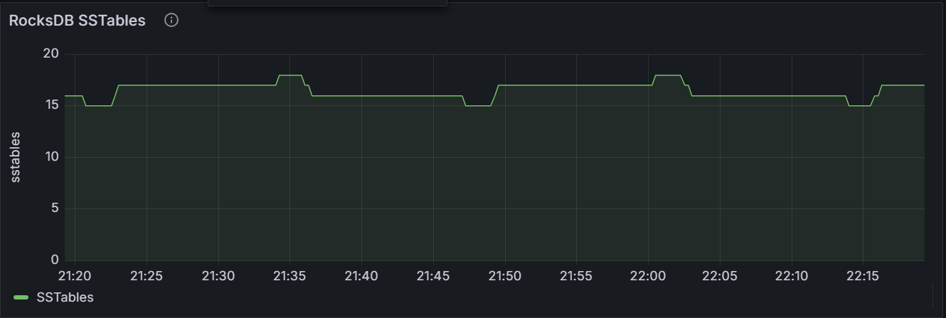在节点视图中,该时间序列图展示指定节点在用的 RocksDB SSTable 的数目。在集群视图中,该时间序列图展示集群中所有节点在用的 RocksDB SSTable 的数目总和。