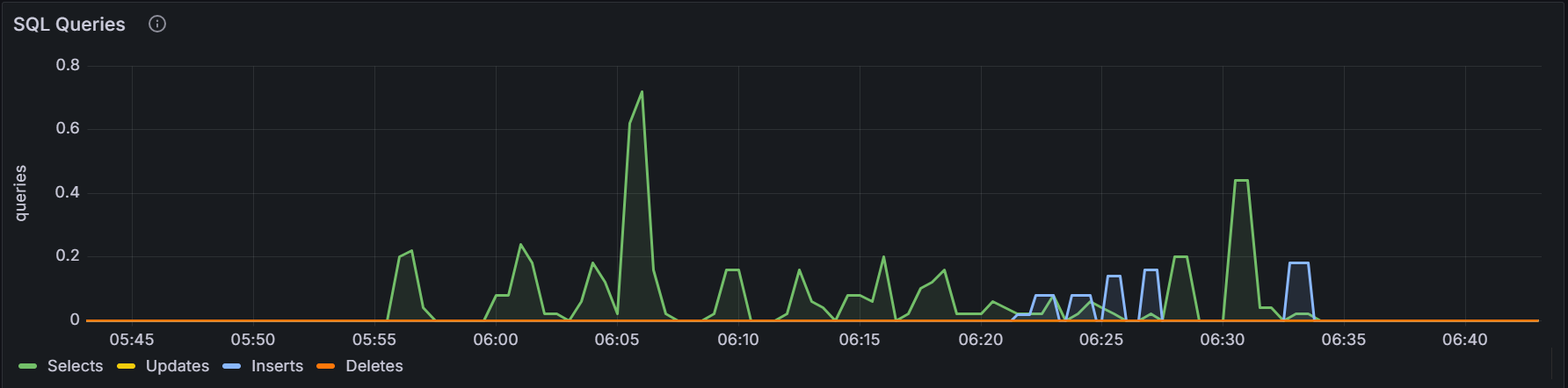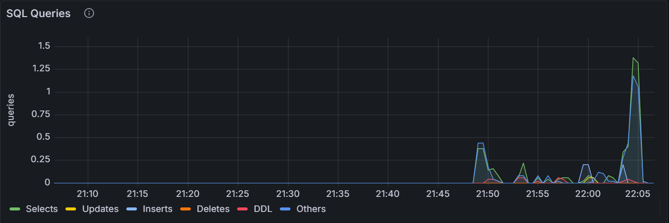 在节点视图中,该时间序列图展示指定节点处理客户端请求的 QPS(Queries Per Second,每秒查询数)。支持的类型包括查询、更新、插入、删除。采样值为