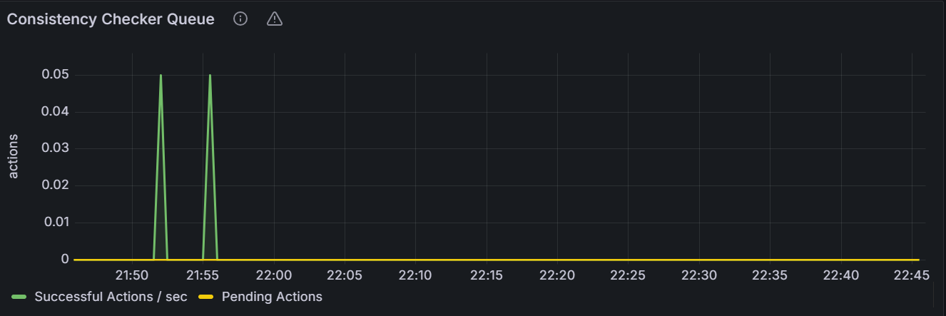 在节点视图中,该时间序列图展示指定节点一致性检查器队列数目。在集群视图中,该时间序列图展示集群中所有节点一致性检查器队列数目总和。