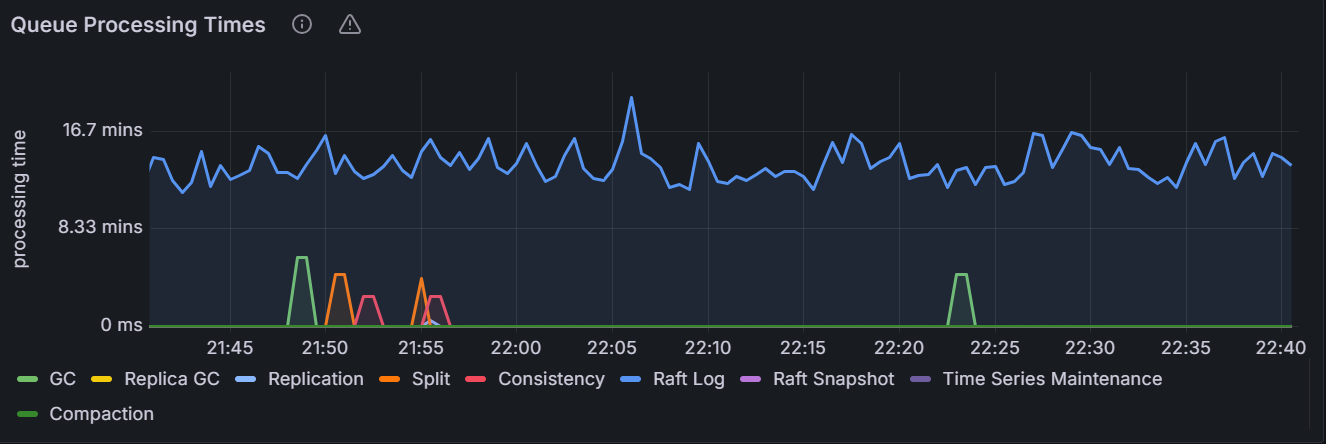 在节点视图中,该时间序列图展示指定节点各队列处理时间。在集群视图中,该时间序列图展示集群中所有节点各队列处理时间的总和。