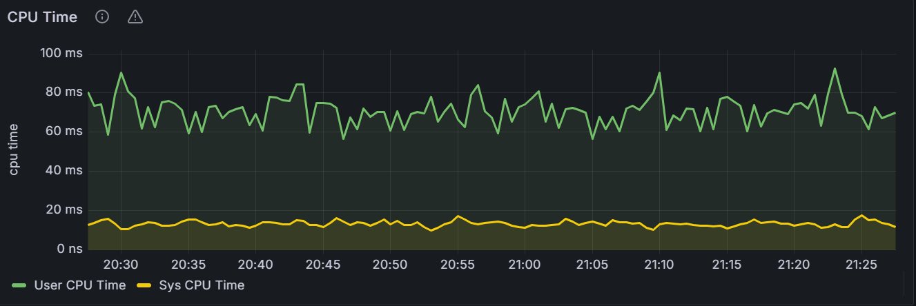 在节点视图中,该时间序列图展示指定节点上的 KaiwuDB 用户级进程和相关系统级操作的 CPU 时间。在集群视图中,该时间序列图展示集群中所有节点的 KaiwuDB 用户级进程和相关系统级操作的 CPU 时间总和。