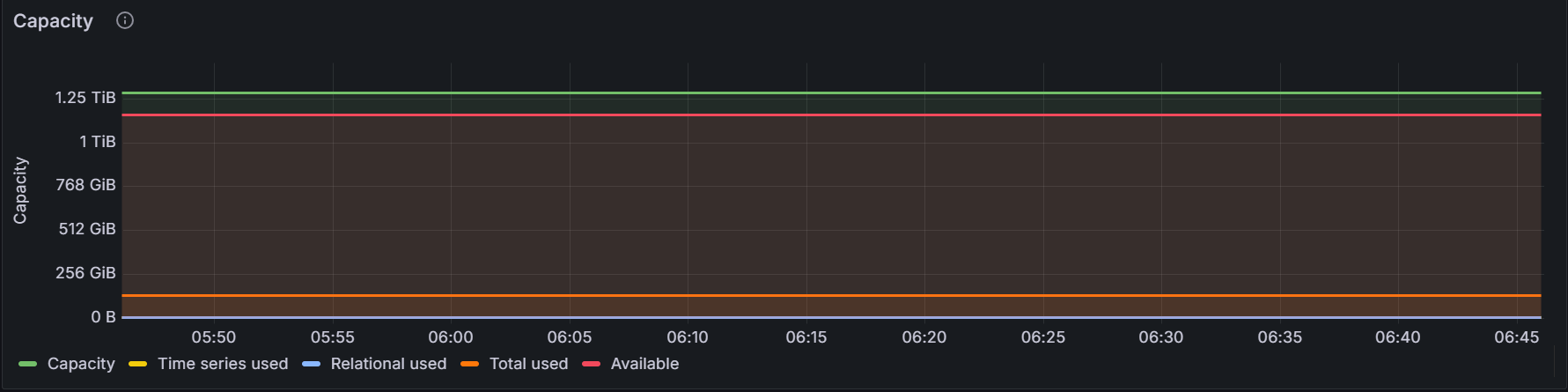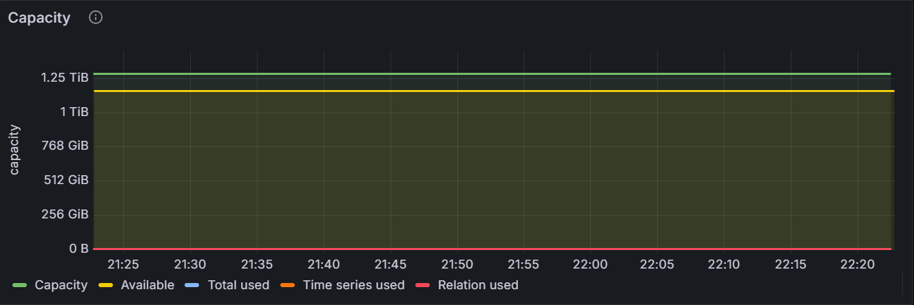 在节点视图中,该时间序列图展示指定节点的总容量(即数据库占用的磁盘空间)、时序数据库占用的磁盘空间、关系数据库占用的磁盘空间、时序和关系数据库已用总空间和磁盘剩余空间。在集群视图中,该时间序列图展示集群中所有节点的磁盘总空间、时序数据库占用的总磁盘空间、关系数据库占用的总磁盘空间、时序和关系数据库已用总空间和磁盘剩余空间。