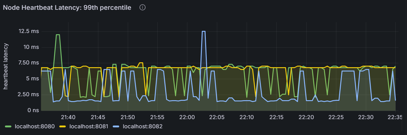 在节点视图中,该时间序列图展示指定节点心跳延迟的 99th 百分位数,即在观察时间内,99% 的心跳延迟低于或等于这个值。在集群视图中,该时间序列图展示集群中所有节点心跳延迟的 99th 百分位数,即在观察时间内,99% 的节点的心跳延迟低于或等于这个值。
