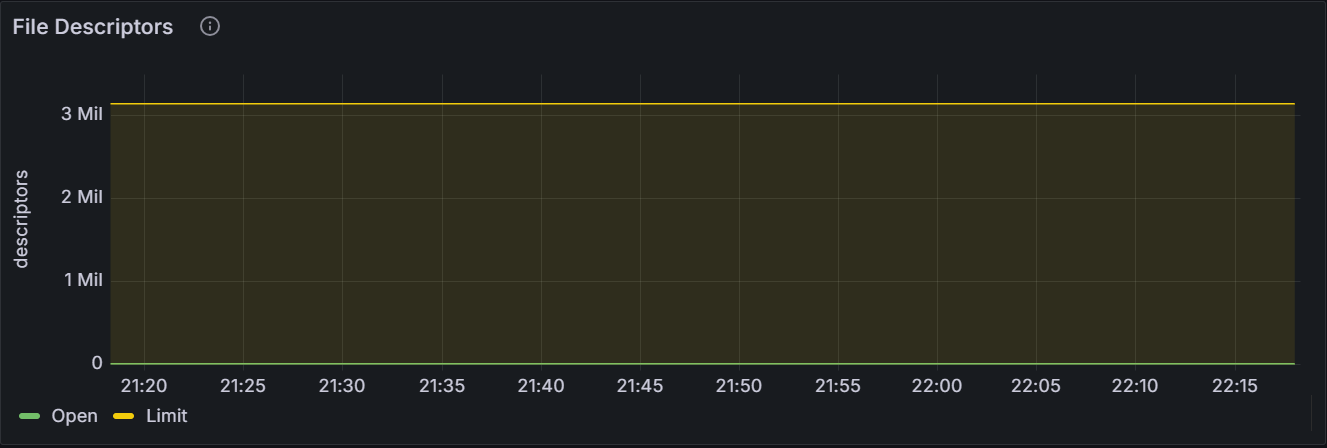 该时间序列图展示指定节点或者集群内所有节点开放的文件描述符数量以及文件描述符数量的上限。