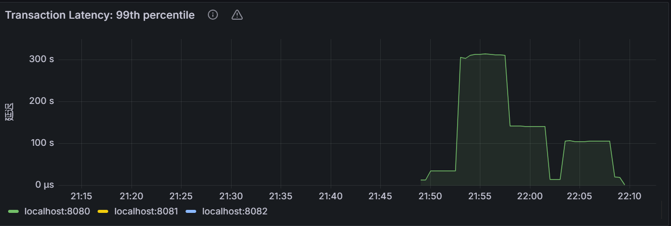 在节点视图中,该时间序列图展示指定节点在一分钟内事务延迟的 99th 百分位数,即在观察时间内,99% 的事务延迟低于或等于这个值。在集群视图中,该时间序列图展示集群中所有节点在一分钟内事务延迟的 99th 百分位数,即在观察时间内,99% 的节点的事务延迟低于或等于这个值。