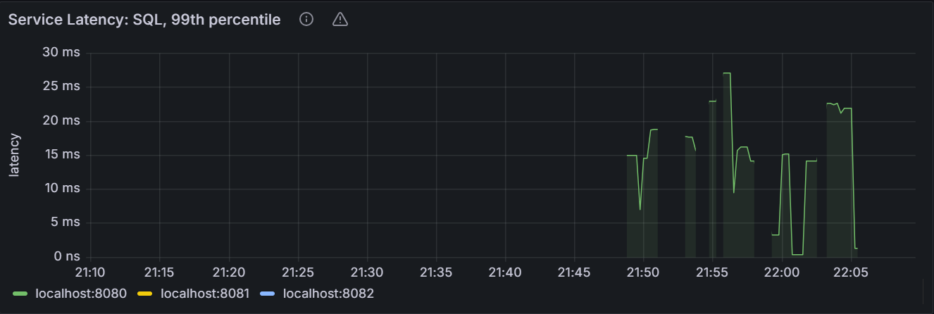 10秒内的平均值。在集群视图中,该时间序列图展示当前集群查询负载的估计值。该估计值为每个节点最近10秒的活动情况的汇总值。Service Latency: SQL 99th percentile