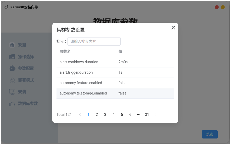 (可选)点击设置集群参数按钮,根据需要设置集群参数值。KaiwuDB 支持的集群参数列表参见实时参数。