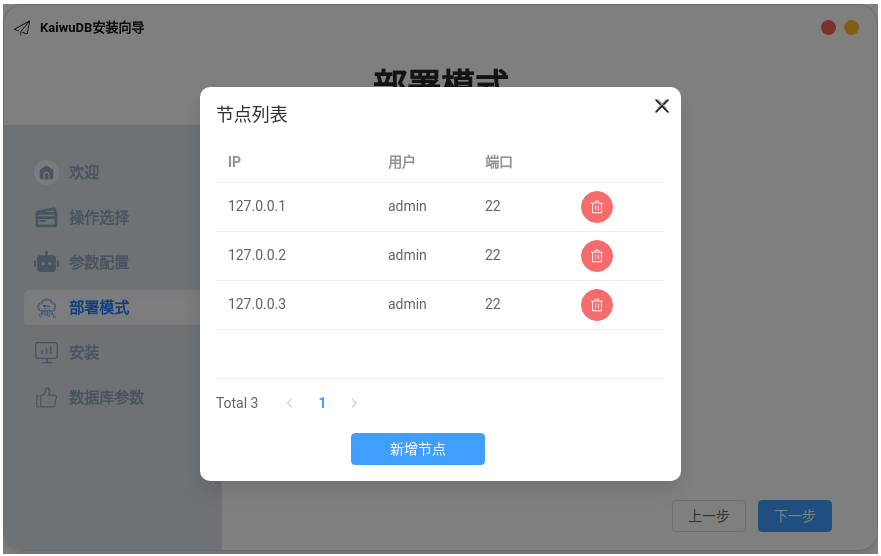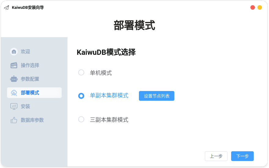 在部署模式页面,勾选单副本集群模式或三副本集群模式,点击设置节点列表。