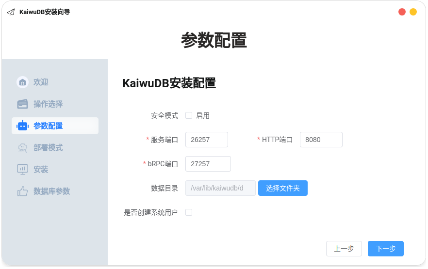 - 用户创建选项:如果跳过,系统将默认使用部署数据库时的用户,且无需密码访问数据库。注意:容器环境下不支持创建系统用户。