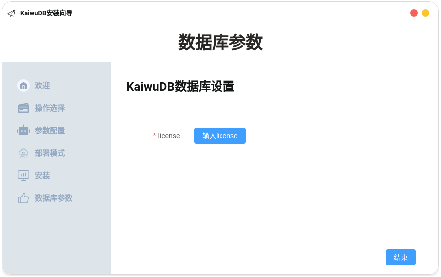 (可选),如已提前申请许可证,在数据库参数页面,点击输入license, 在许可证验证窗口输入许可证代码,然后点击提交。