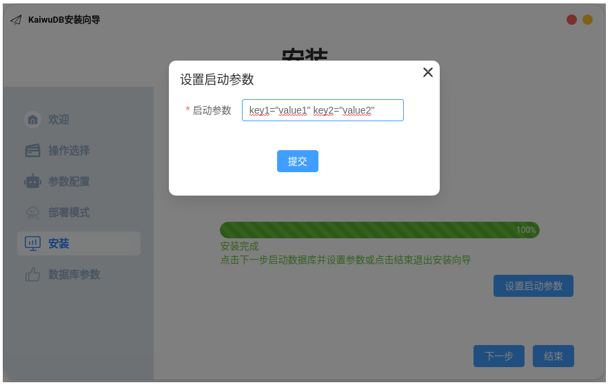 设置启动参数, 然后点击提交。KaiwuDB 支持设置多个启动参数,用空格分隔。三副本集群支持的参数列表参见 kwbase start,单副本集群支持的参数列表参见 kwbase start-single-replica。