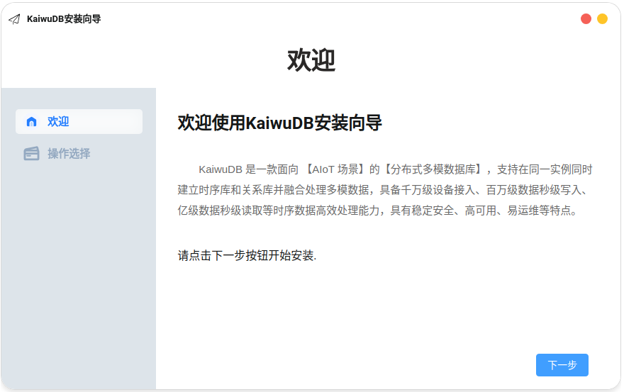 sudo usermod -aG docker $USER命令将用户添加到docker组。 - 已获取对应系统版本的 KaiwuDB 可视化向导安装程序(.AppImage 格式)。