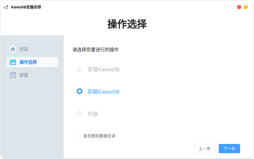 使用可视化向导卸载 KaiwuDB 时,不会删除用户的数据目录。如需删除数据目录,请手动删除。