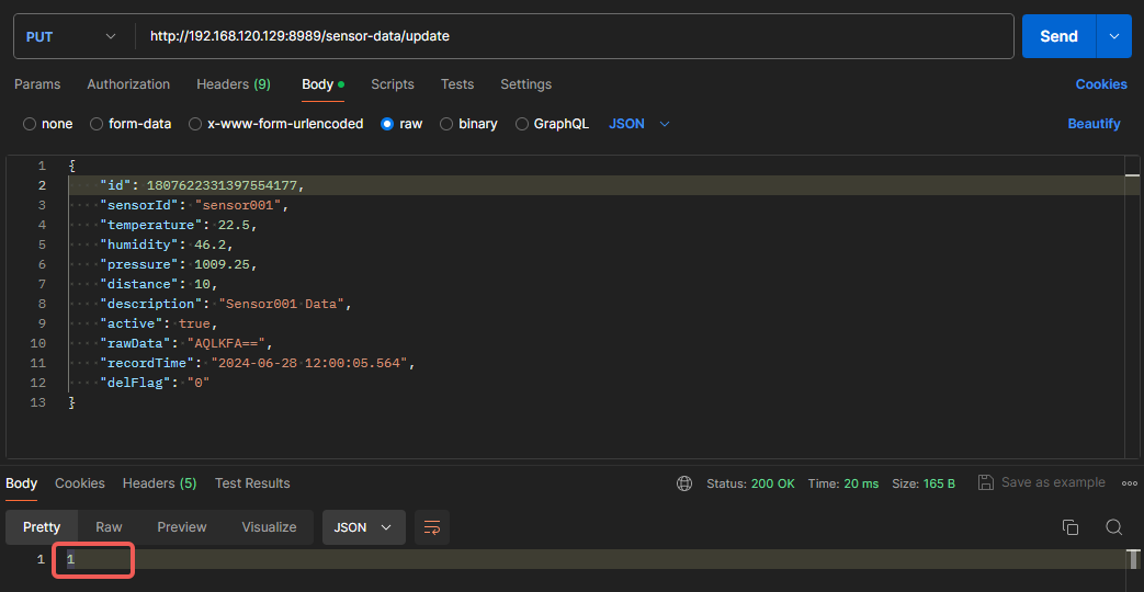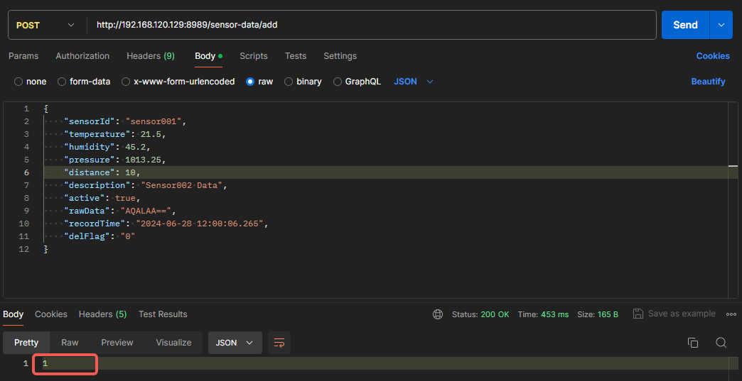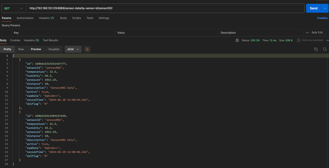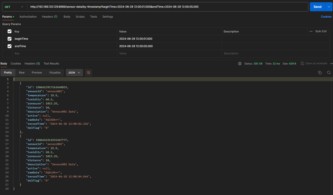 SensorDataMapper自定义 SQL 方法,比如按照record_time查询数据的接口。List<SensorData> selectListBetweenTime( @Param("beginTime") LocalDateTime beginTime, @Param("endTime") LocalDateTime endTime);结果如下: