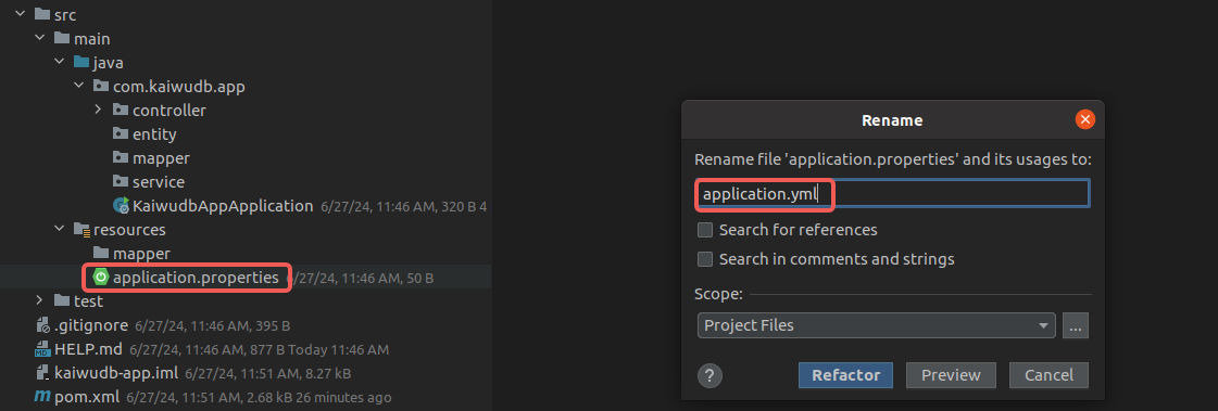 /src/main/resources目录下的application.properties修改为更常用的application.yml文件。