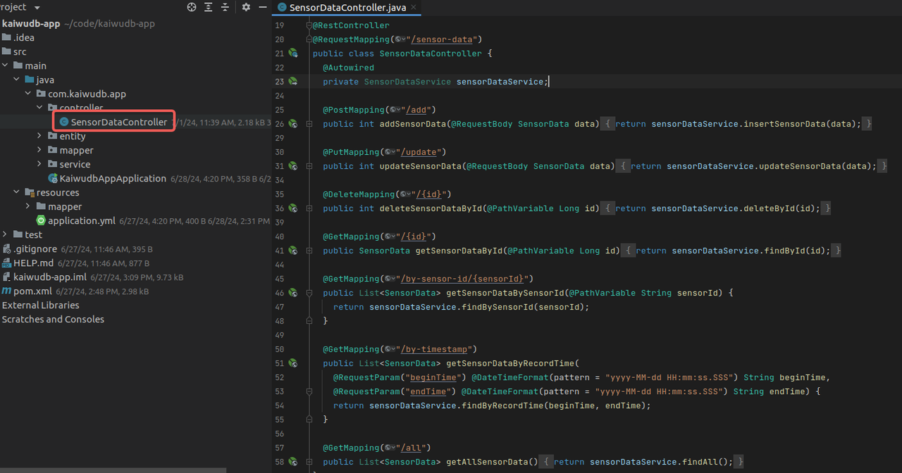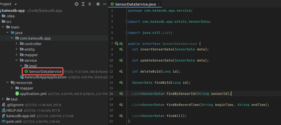 service目录下创建SensorDataService接口服务类和对应的实现类SensorDataServiceImpl,使用自定义的SensorDataMapper数据访问接口类进行数据的增改删查操作,其中数据查询接口扩展了多种查询方式,包括:按 ID 查询、按 sensorId 查询、按时间范围查询和查询全部数据。SensorDataService接口服务类package com.kaiwudb.app.service; import com.kaiwudb.app.entity.SensorData; import java.util.List; public interface SensorDataService { int insertSensorData(SensorData data); int updateSensorData(SensorData data); int deleteById(Long id); SensorData findById(Long id); List<SensorData> findBySensorId(String sensorId); List<SensorData> findByRecordTime(String beginTime, String endTime); List<SensorData> findAll(); }结果如下: