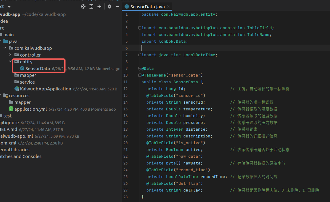 entity目录下创建记录传感器数据的实体类SensorData,加入@Data和@TableName注解,从而自动为实体类的字段生成getter、setter、equals、canEqual、hashCode和toString方法,指定实体类对应的数据表名称。package com.kaiwudb.app.entity; import com.baomidou.mybatisplus.annotation.TableField; import com.baomidou.mybatisplus.annotation.TableName; import lombok.Data; import java.time.LocalDateTime; @Data @TableName("sensor_data") public class SensorData { private Long id; // 主键,自动增长的唯一标识符 @TableField("sensor_id") private String sensorId; // 传感器的唯一标识符 private Double temperature; // 传感器读取的温度数据 private Double humidity; // 传感器读取的湿度数据 private Double pressure; // 传感器读取的压力数据 private Integer distance; // 传感器距离 private String description; // 传感器的详细描述信息 @TableField("is_active") private Boolean active; // 表示传感器是否处于活动状态 @TableField("raw_data") private byte[] rawData; // 存储传感器数据的原始字节 @TableField("record_time") private LocalDateTime recordTime; // 记录数据插入的时间戳 @TableField("del_flag") private String delFlag; // 传感器是否删除标志位,0-未删除,1-已删除 }结果如下: