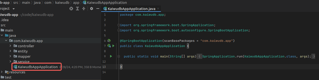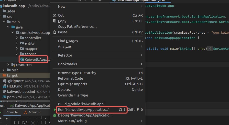 KaiwudbAppApplication的主程序,单击右键,选择Run'KaiwudbAppApplication'来启动应用程序: