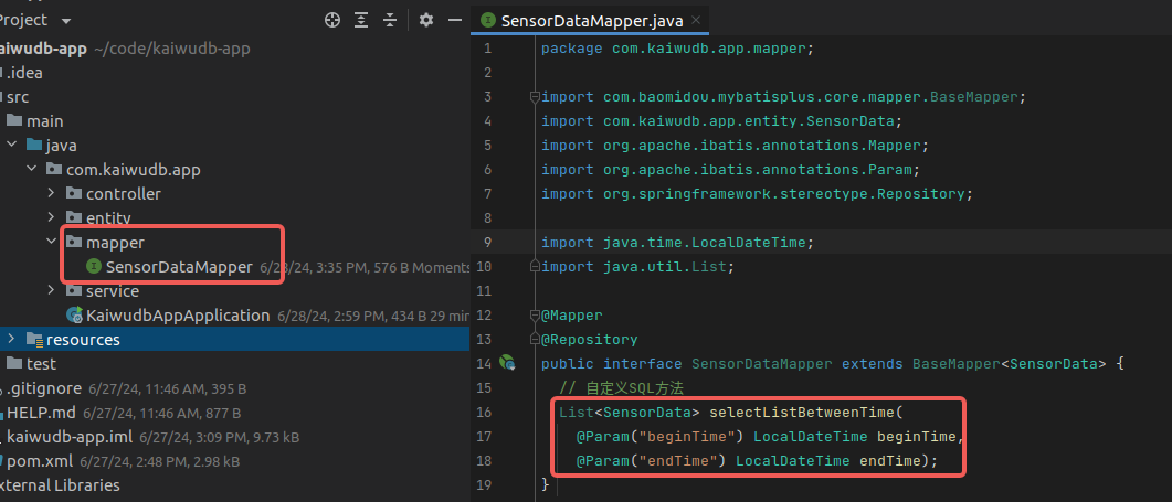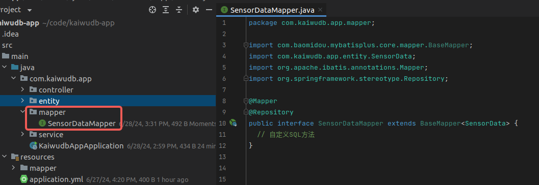 mapper目录下创建SensorDataMapper,继承BaseMapper接口,使用@Mapper和@Repository注解,以快速实现常见的数据插入、更新、删除和查询等操作。package com.kaiwudb.app.mapper; import com.baomidou.mybatisplus.core.mapper.BaseMapper; import com.kaiwudb.app.entity.SensorData; import org.apache.ibatis.annotations.Mapper; import org.springframework.stereotype.Repository; @Mapper @Repository public interface SensorDataMapper extends BaseMapper<SensorData> { // 自定义SQL方法 }结果如下: