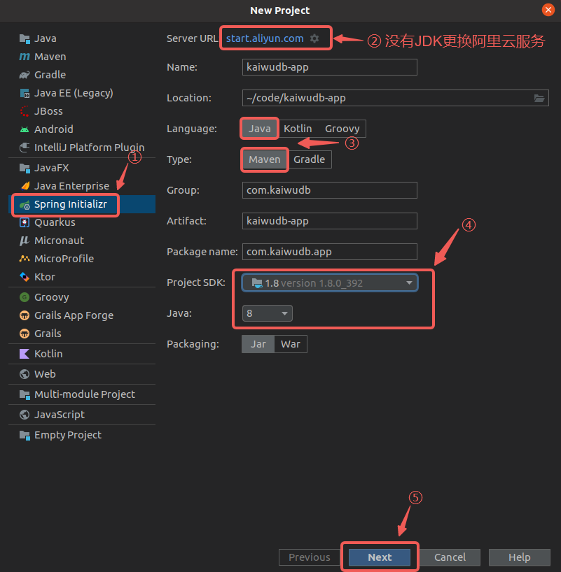 由于官网默认 JDK 最低版本为 JDK 17,需要先将 Server URL 地址更换为阿里云服务:start.aliyun.com,再设置 Java 版本。