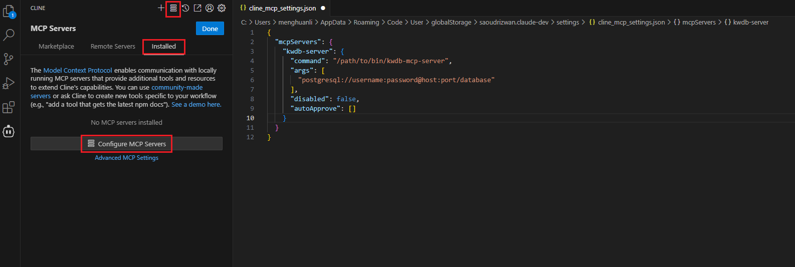 "mcpServers": { "kwdb-server": { "command": "/path/to/bin/kwdb-mcp-server", "args": [ "postgresql://<username>:<password>@<host>:<port>/<database_name>" ], "disabled": false, "autoApprove": [] } }参数说明: