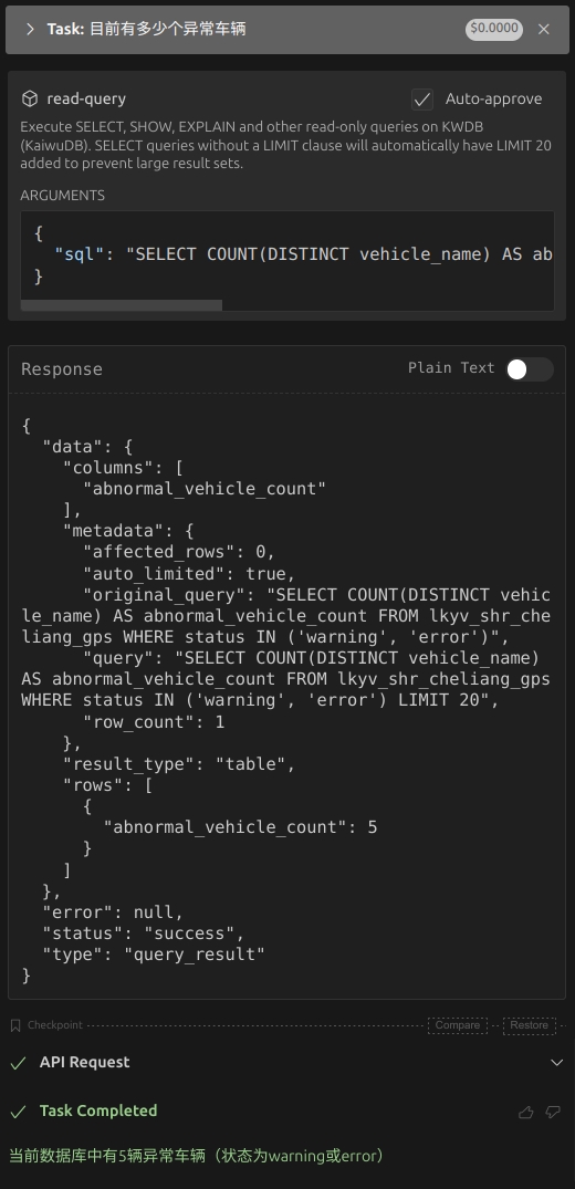 从上图中可以看出,Cline 调取 KWDB MCP Server 的 read-query 工具,统计表中 status 列值为 warning 和 error 的数据。最后再由 Cline 中配置的大模型来汇总数据。