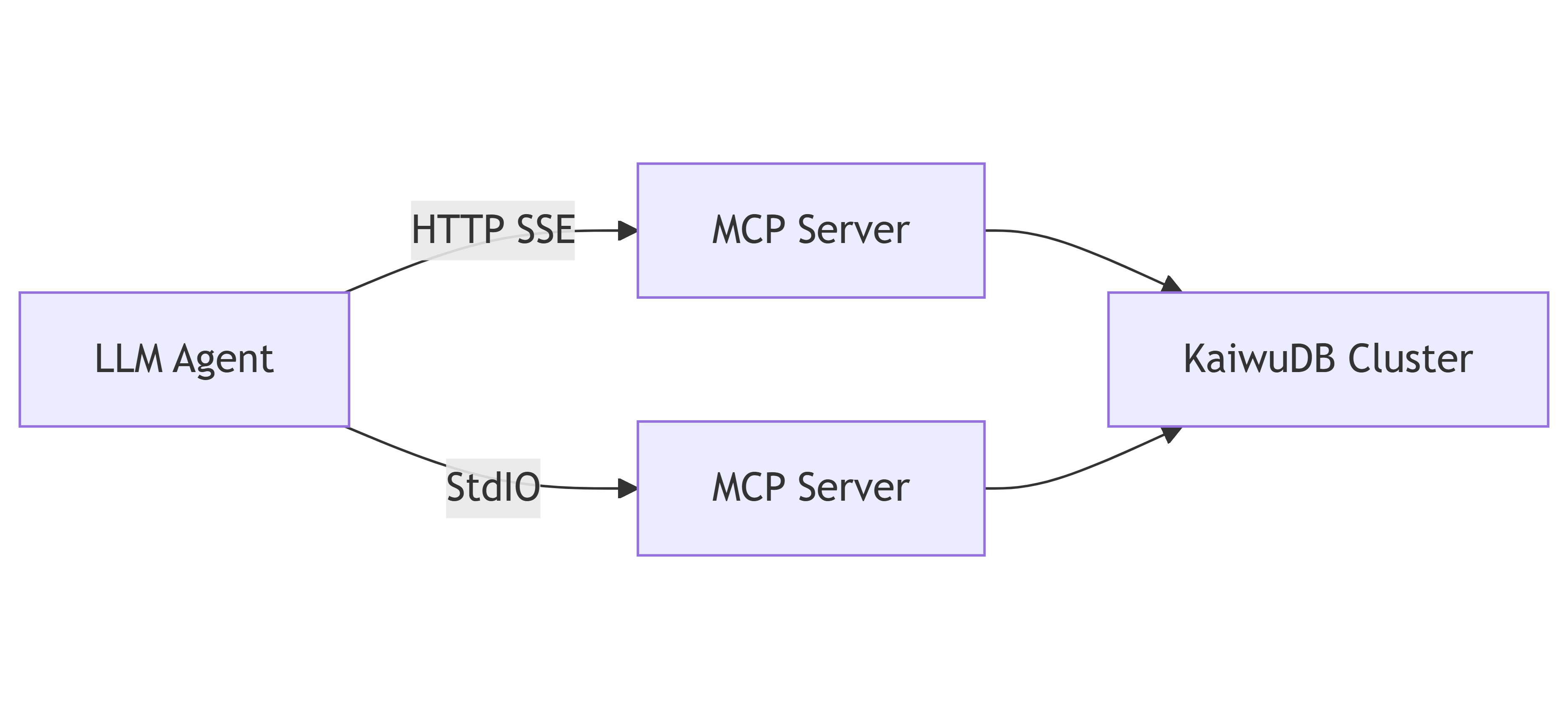 KWDB MCP Server 可与任何支持 MCP 协议的 LLM Agent 配合使用。LLM Agent 通过 Streamable HTTP 传输协议或 StdIO 标准输入/输出协议连接 KWDB MCP Server,然后连接 KaiwuDB 数据库,执行创建、插入和查询操作。