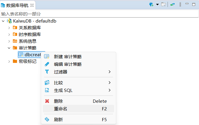 在数据库导航区,右键单击需要重命名的审计策略,然后选择重命名。