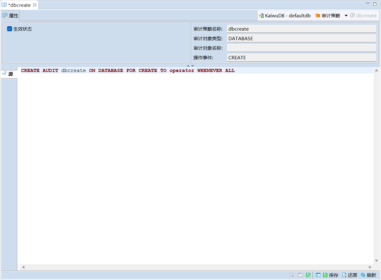 - 在数据库导航区,双击需要查看的审计策略,即可在该审计策略的属性页查看生效状态、审计策略名称、对象类型等信息。