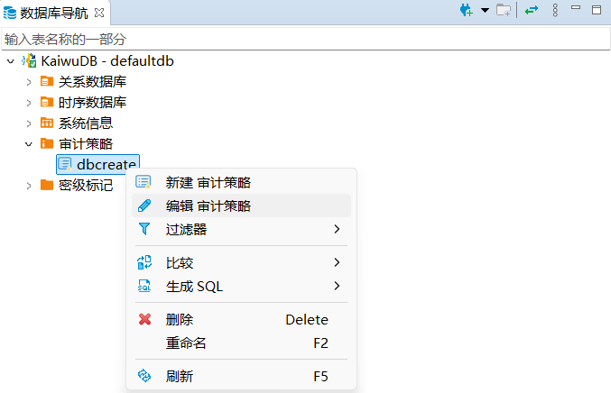 在数据库导航区,右键单击需要编辑的审计策略,然后选择编辑审计策略。