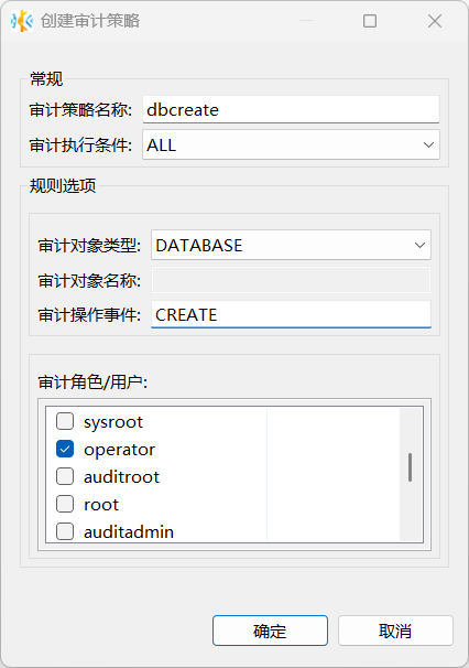 ALL)、审计对象类型、对象名称(用于进行对象级审计,对象类型必须是 table 或 view)、操作事件和角色或用户,然后点击确定。