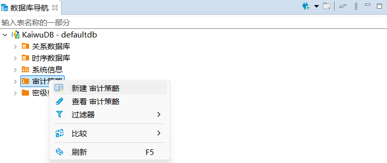 在数据库导航区,右键单击审计策略,选择新建审计策略。