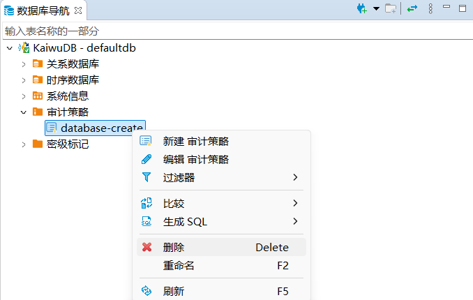 在数据库导航区,右键单击需要删除的审计策略,然后选择删除。